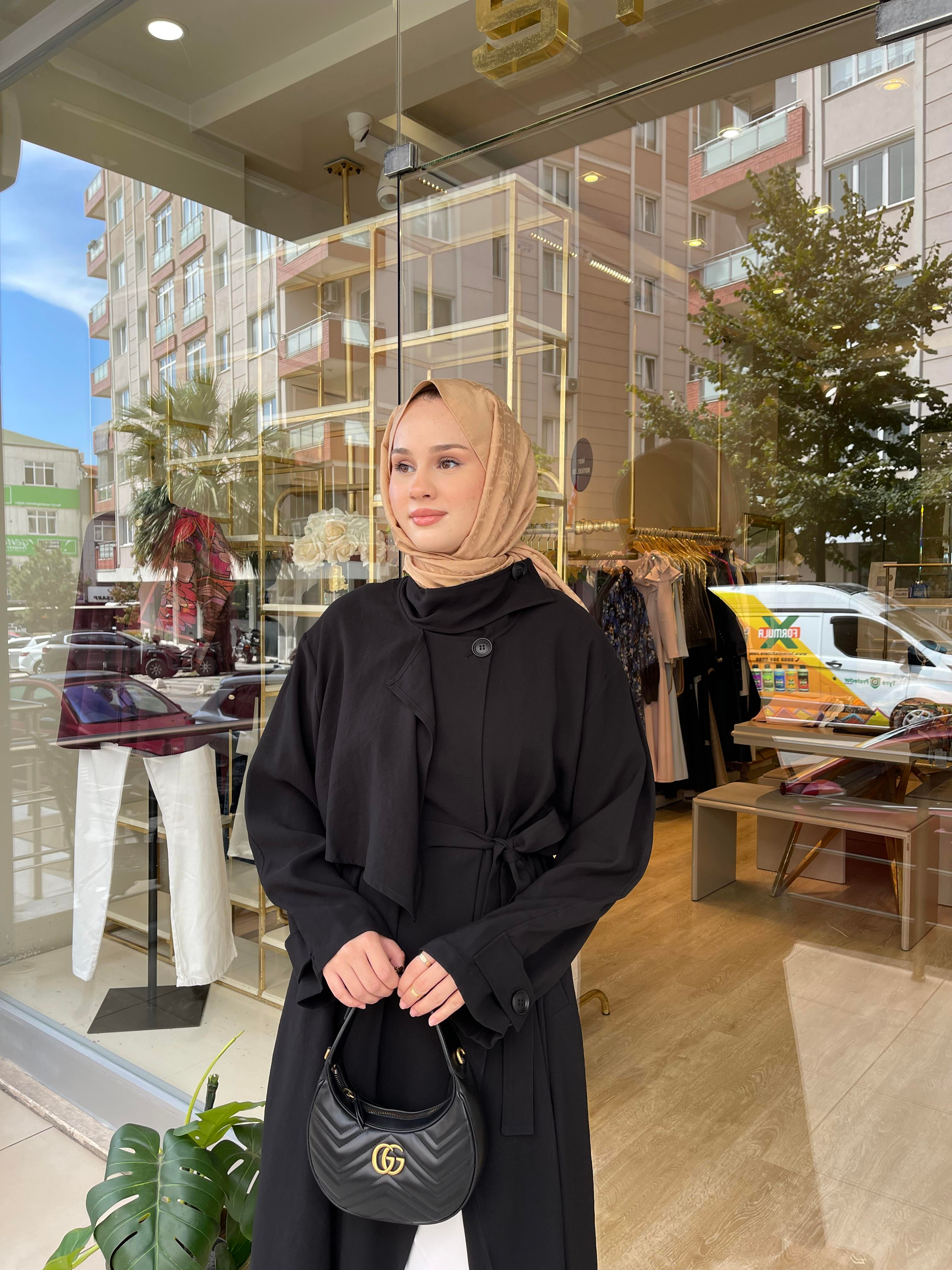 Modal kumaş, sağ bedende aller parçalı, kemerli, yan cepli
