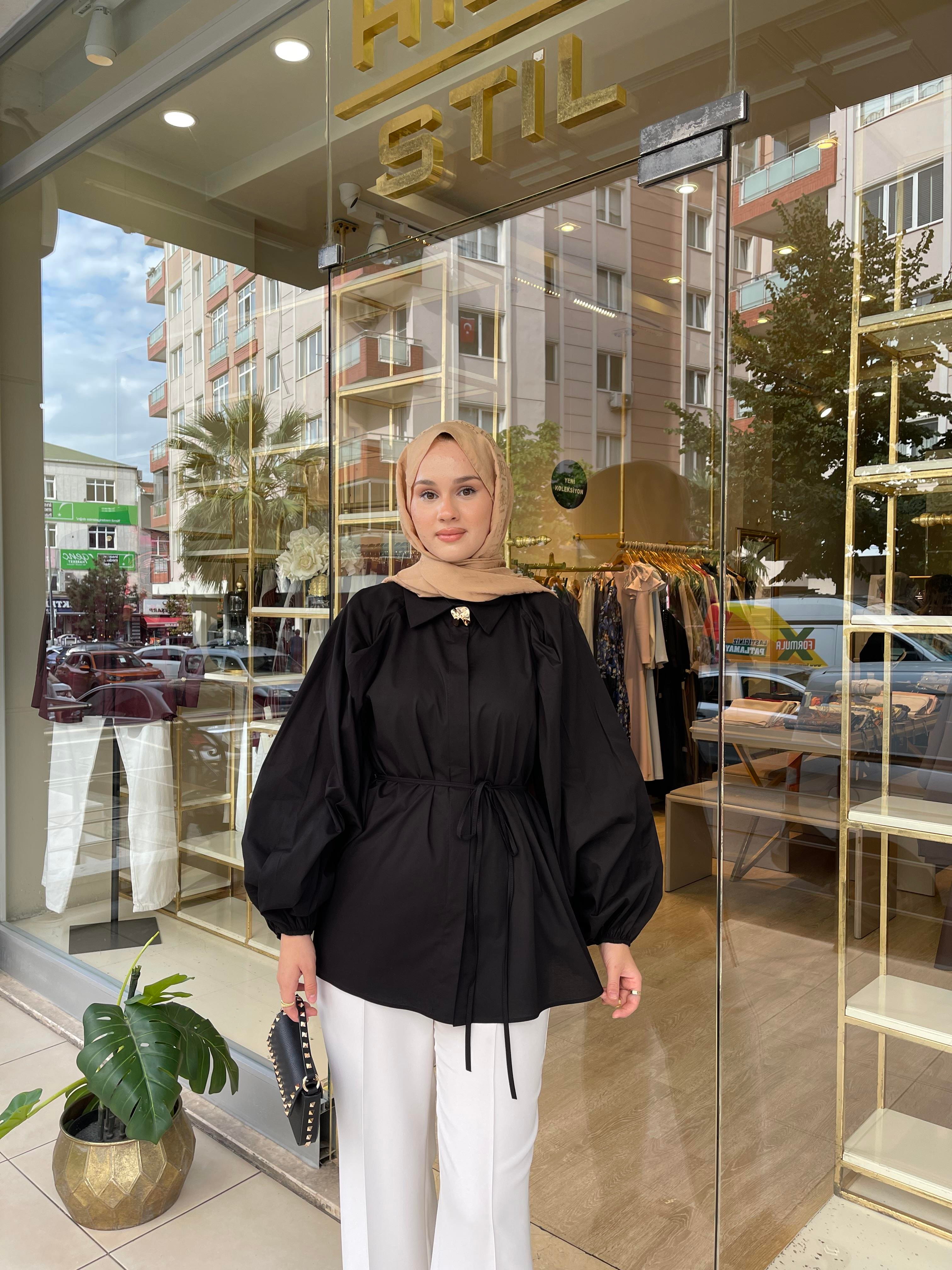• Model Detayı: Klasik yaka, volanlı geniş kollar ve rahat kesim ile modern bir görünüm sunar.