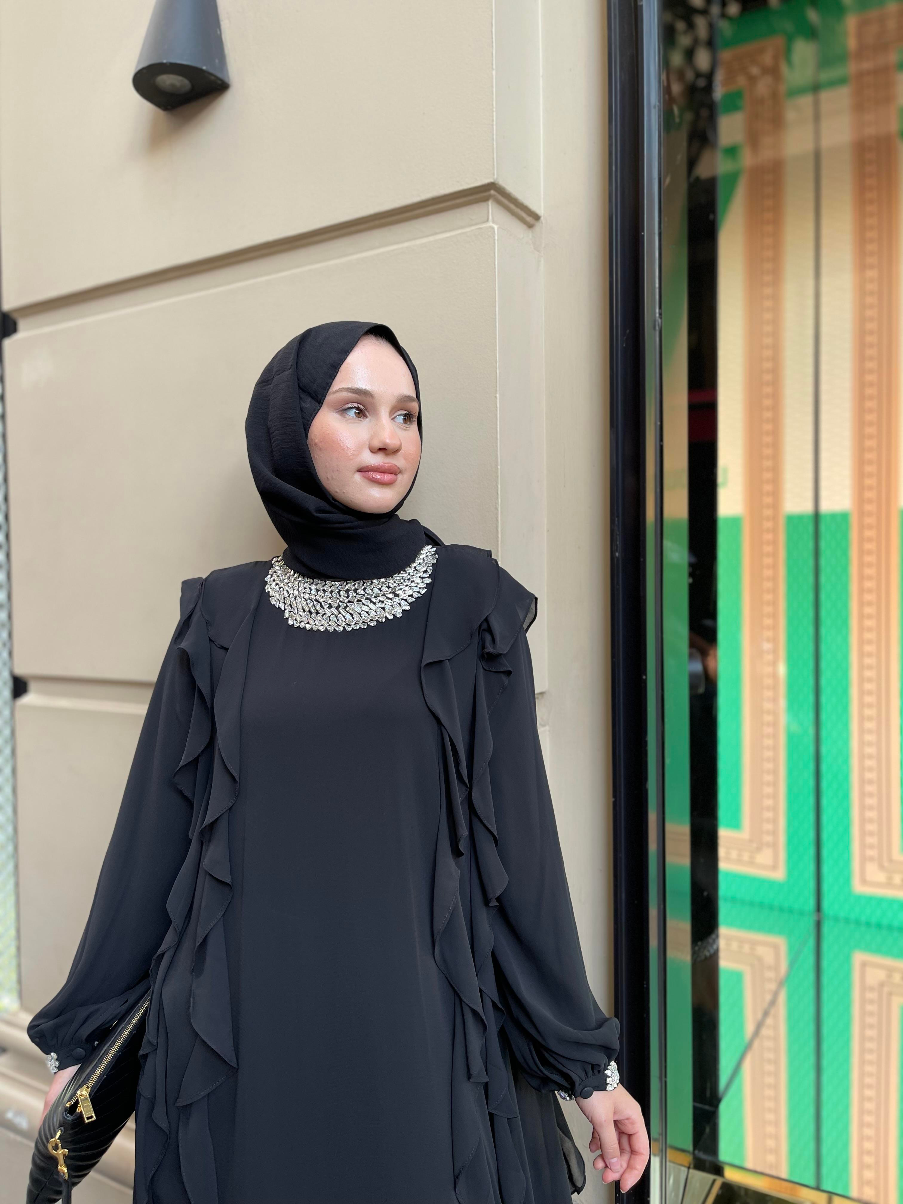 TAŞLI FIRFIRLI ELBİSE SİYAH