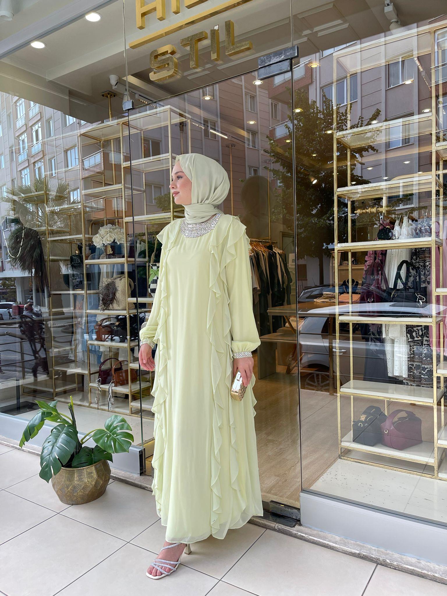 TAŞLI FIRFIRLI ELBİSE YEŞİL